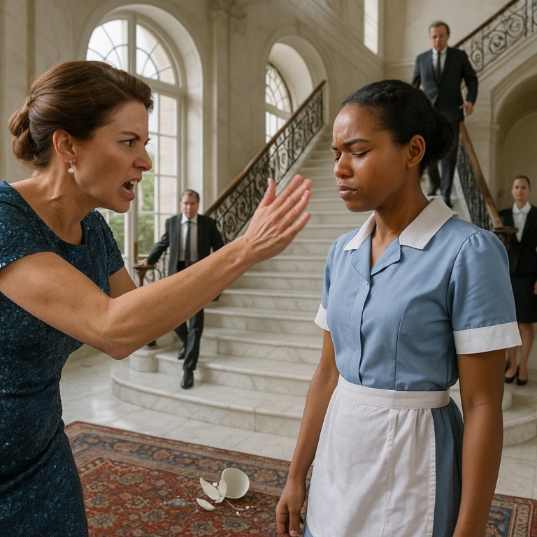 Olivia Hughes, the billionaire’s new wife, stood in a glittering blue dress, eyes blazing, her hand still pressed against the cheek of a young maid in a crisp blue-and-white uniform. The maid—Aisha Daniels—winced but didn’t move away.